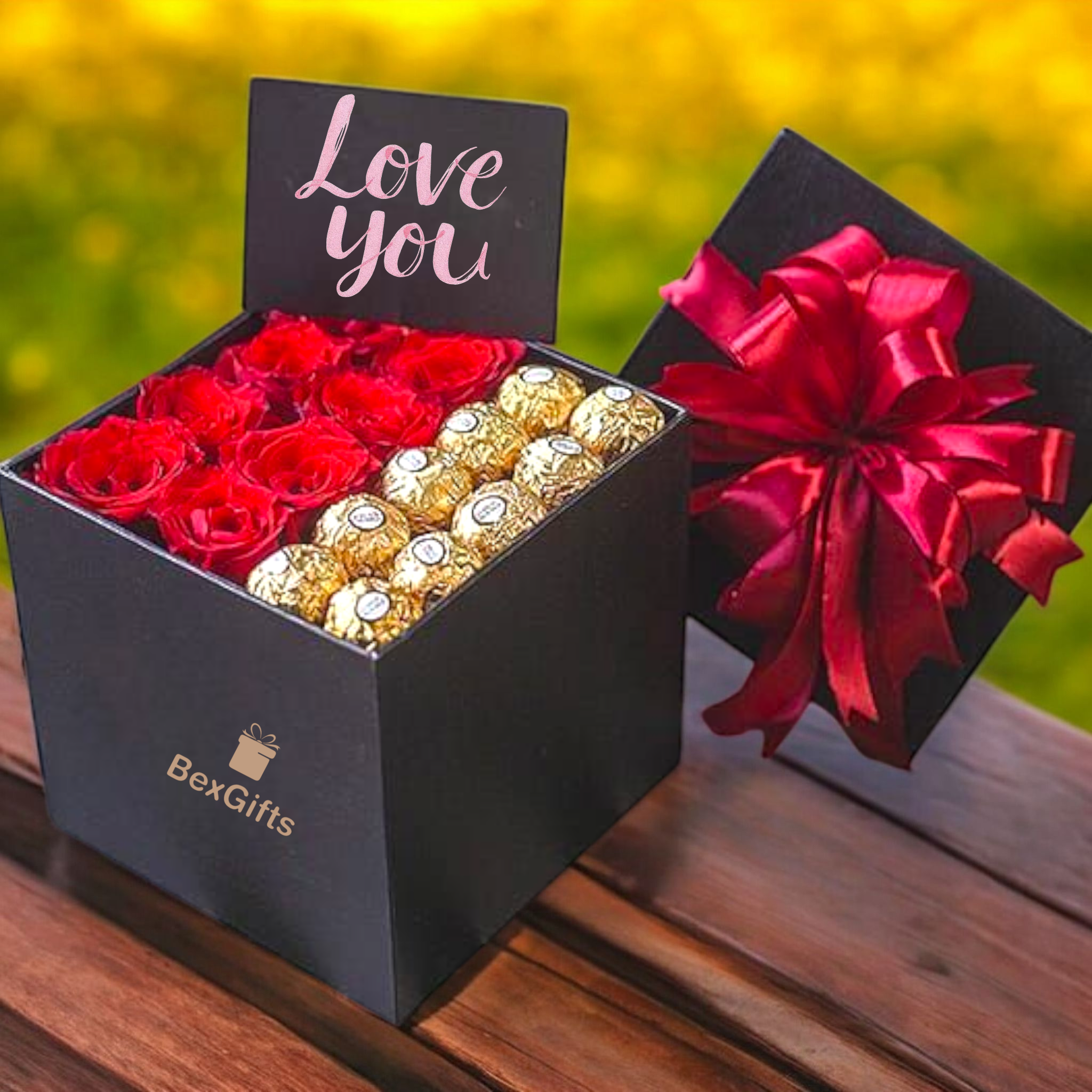 Indulge in the perfect blend of love and luxury with our Rosy Ferrero Elegance featuring 8 fresh red roses and 8 Ferrero Rocher chocolates, beautifully arranged in a black onyx box. A timeless gift for any special occasion!